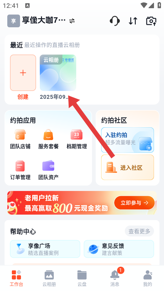 1、在享像派工作臺界面,點擊要上傳照片的云相冊,進入該云相冊詳情頁。