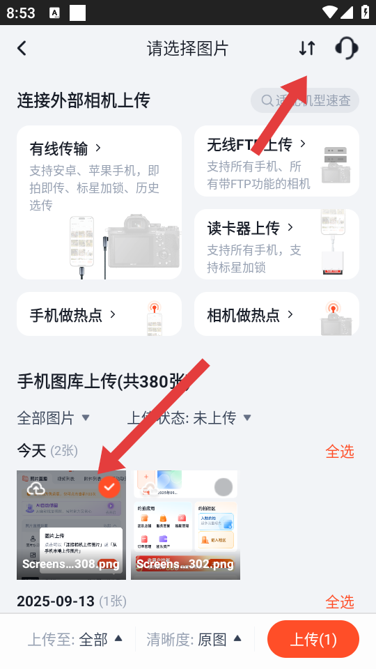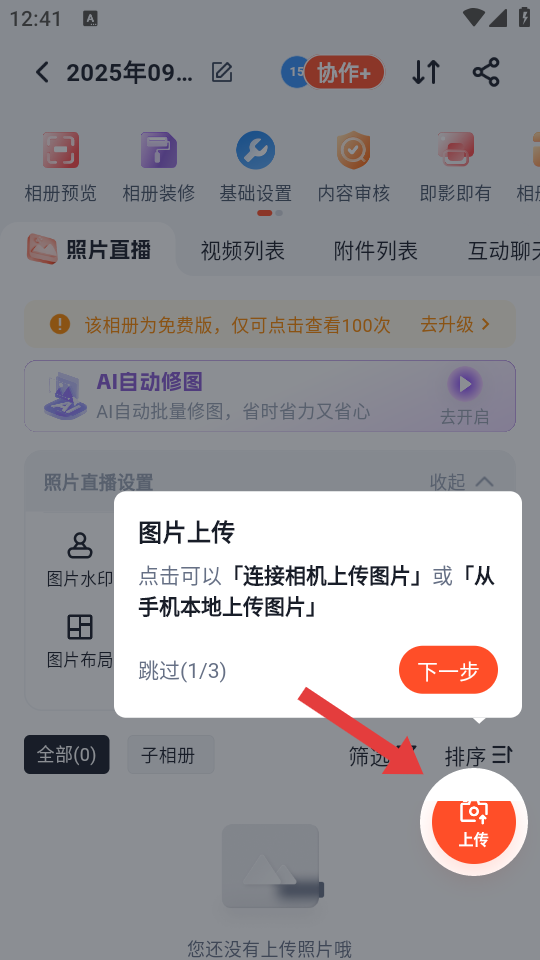 2、在云相冊詳情頁,點擊右下角的上傳按鈕,彈出圖片選擇界面。