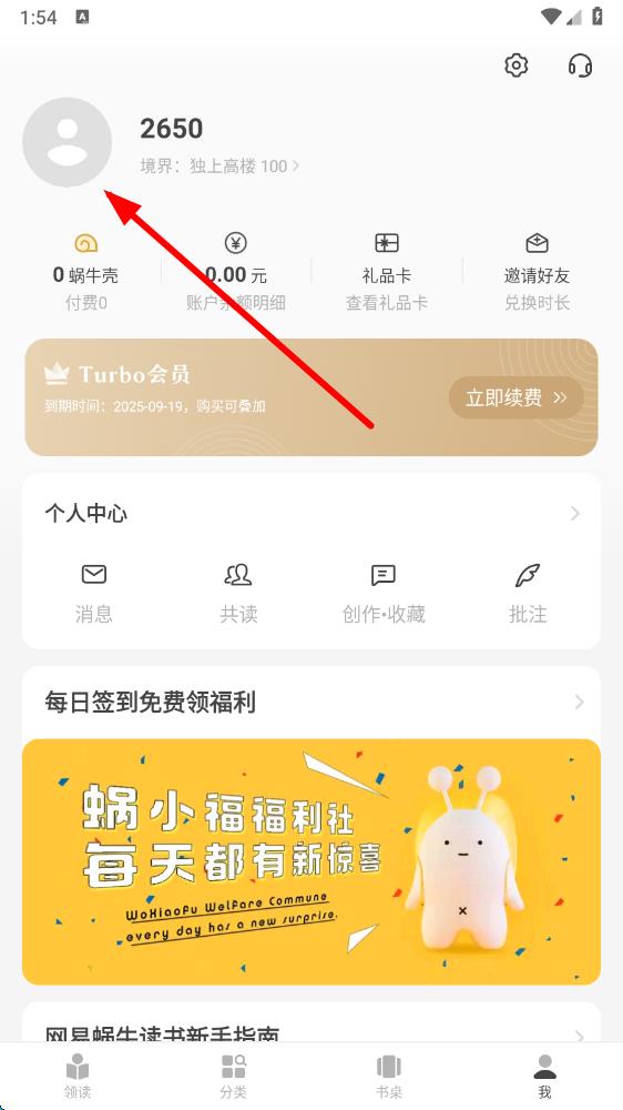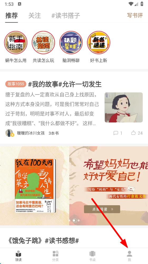 1、打開(kāi)網(wǎng)易蝸牛讀書(shū)app,點(diǎn)擊界面底部的我,進(jìn)入個(gè)人相關(guān)頁(yè)面。