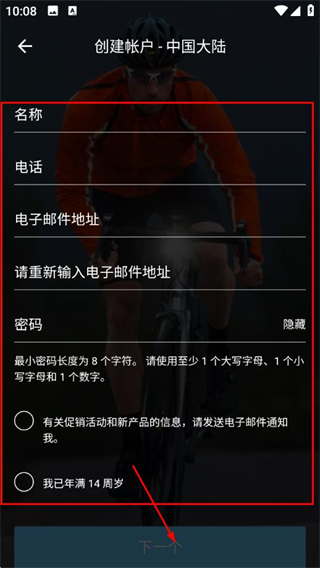 3、填寫名稱、電話、電子郵件地址、密碼,勾選選項,點擊下一個按鈕。