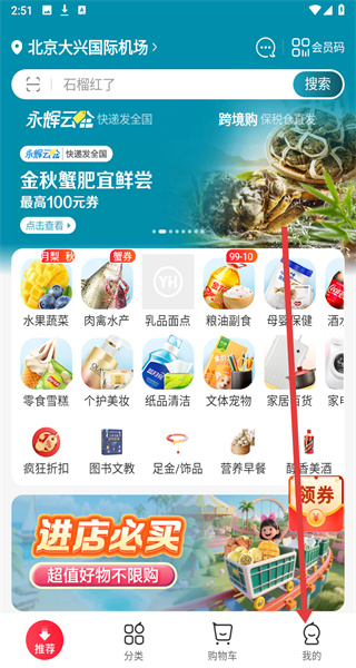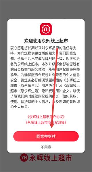 1、可以通過點(diǎn)擊彈窗中的同意并繼續(xù)按鈕,進(jìn)入永輝線上超市首頁開始使用。