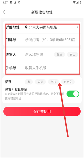 4、跳轉(zhuǎn)到新增收貨地址頁面后,可以依次點(diǎn)擊輸入框進(jìn)行填寫新地址信息,完成后點(diǎn)擊保存按鈕。