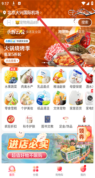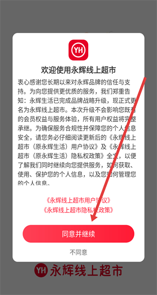 1、點擊“歡迎使用永輝線上超市”彈窗的“同意并繼續(xù)”,進入永輝線上超市APP主界面。