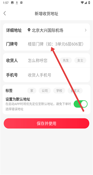 4、新增收貨地址頁面輸入門牌號、收貨人、手機號等信息,點擊保存并使用,完成收貨地址添加操作。