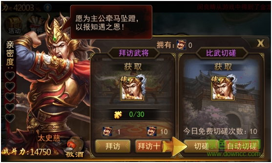 玩家Lv.24后開(kāi)放[切磋]系統(tǒng),這是獲取武將的玩法之一,戰(zhàn)斗勝利后即可獲得該城池守將將魂。