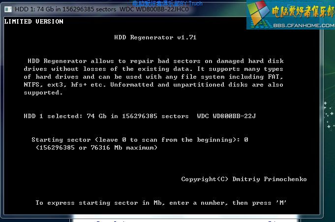 出現(xiàn)一個DOS畫面,要求你在閃爍的橫線處輸入數(shù)字,可以默認(rèn)為0直接回車掃描,如果知道壞道的字節(jié)處,也可以輸入有壞道的數(shù)值,再回車。這里我選擇默認(rèn)0,代表重0字節(jié)開始掃描
