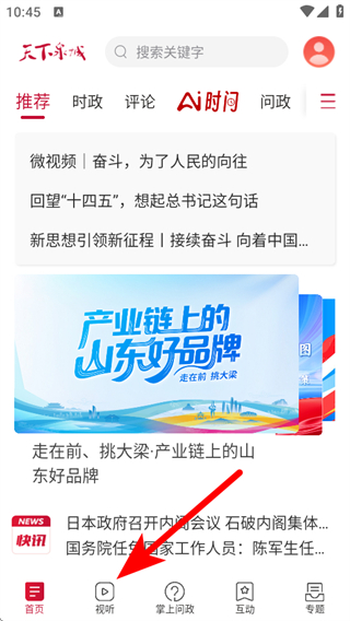 1、打開天下泉城app,點(diǎn)擊底部視聽的按鈕,進(jìn)入視聽的頁面。
