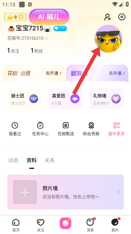 1、打開花椒直播APP,進(jìn)入我的頁面,點(diǎn)擊右上角的個(gè)人頭像,進(jìn)入更換頭像界面。