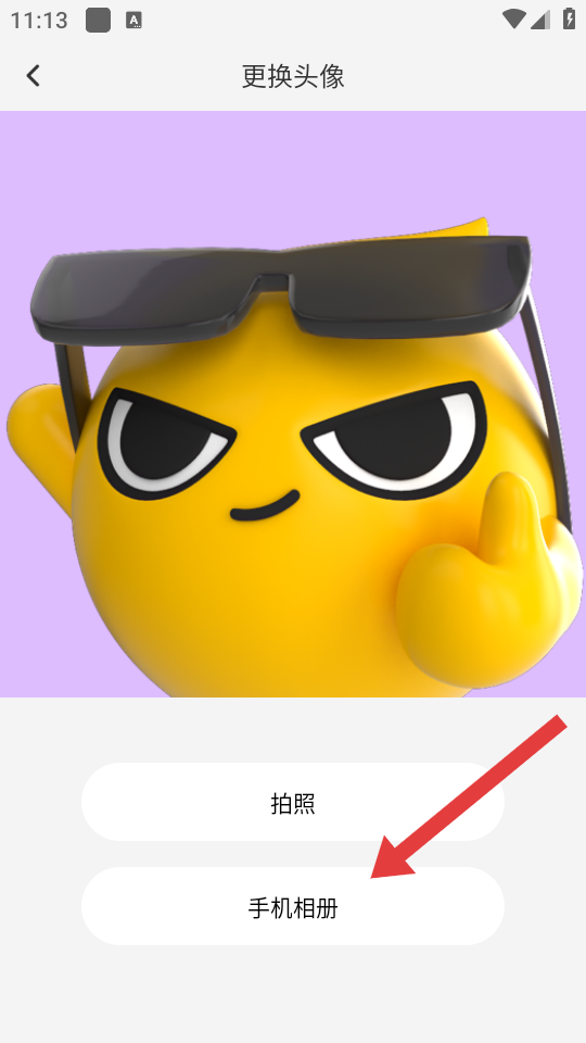 2、在更換頭像的頁面,點(diǎn)擊手機(jī)相冊(cè)的選項(xiàng),進(jìn)入手機(jī)相冊(cè)選擇圖片。
