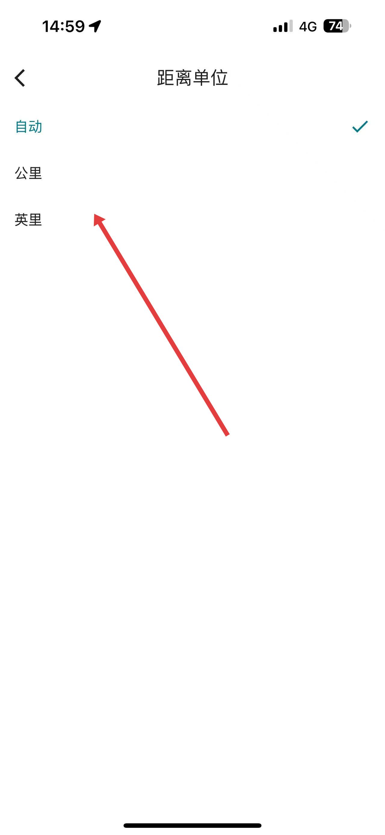 3、在距離單位設(shè)置界面中,可看到有自動(dòng)、公里、英里等選項(xiàng),根據(jù)需求點(diǎn)擊選擇相應(yīng)的距離單位即可。