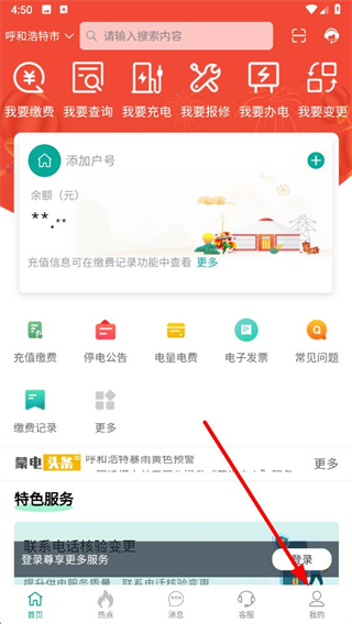 1、打開(kāi)蒙電e家app,點(diǎn)擊底部導(dǎo)航欄的我的選項(xiàng)進(jìn)入個(gè)人頁(yè)面。