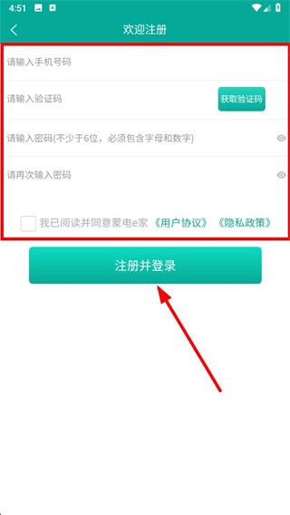 4、在頁(yè)面中,依次在輸入框中輸入信息,勾選我已閱讀并同意用戶協(xié)議隱私政策,點(diǎn)擊注冊(cè)并登錄。