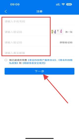 4、在注冊(cè)頁(yè)面內(nèi),輸入手機(jī)號(hào)、驗(yàn)證碼以及郵箱,再點(diǎn)擊下一步即可。