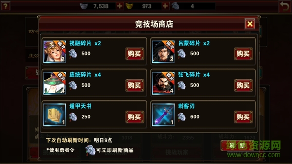 這個界面是所有玩家互相較量的場所。玩家可以自行布陣,進(jìn)行一場酣暢淋漓的格斗,格斗結(jié)束后,玩家戰(zhàn)斗勝負(fù)結(jié)果,將決定其決定在服務(wù)器里的排名。而競技商店里面產(chǎn)出的武將是獨(dú)一無二的,需要擁有一定數(shù)量的挑戰(zhàn)令,方可購買,所以大家一定要多多積攢挑戰(zhàn)令哦!