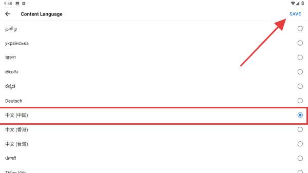 4、進(jìn)入到語(yǔ)言選擇的頁(yè)面內(nèi),向下滑動(dòng)找到并點(diǎn)擊中文,再點(diǎn)擊右上角SAVE的按鈕即可設(shè)置成功。