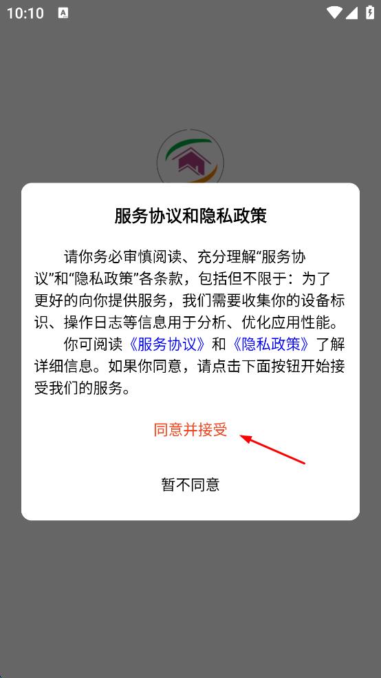 1、打開勞務(wù)相關(guān)軟件,在彈出的服務(wù)協(xié)議和隱私政策頁面,點(diǎn)擊同意并接受,進(jìn)入軟件首頁。