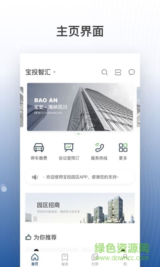 寶投智匯app是專為園區(qū)設(shè)計(jì)的一款智能管理軟件,最新園區(qū)公告及時(shí)更新,支持在線處理物業(yè)信息,還可以一鍵預(yù)約會(huì)議室,完整功能智能辦公效率高,歡迎來(lái)綠色資源網(wǎng)下載!