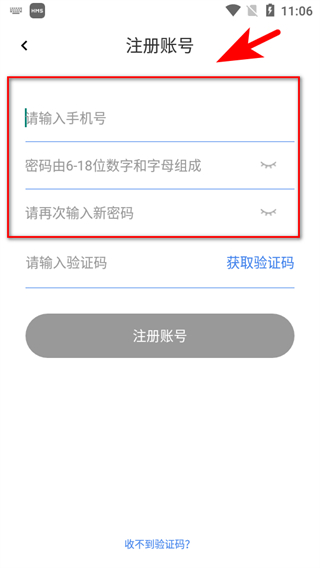 2、在注冊(cè)頁填寫手機(jī)號(hào)、設(shè)置密碼并再次確認(rèn)密碼,準(zhǔn)備完成注冊(cè)。