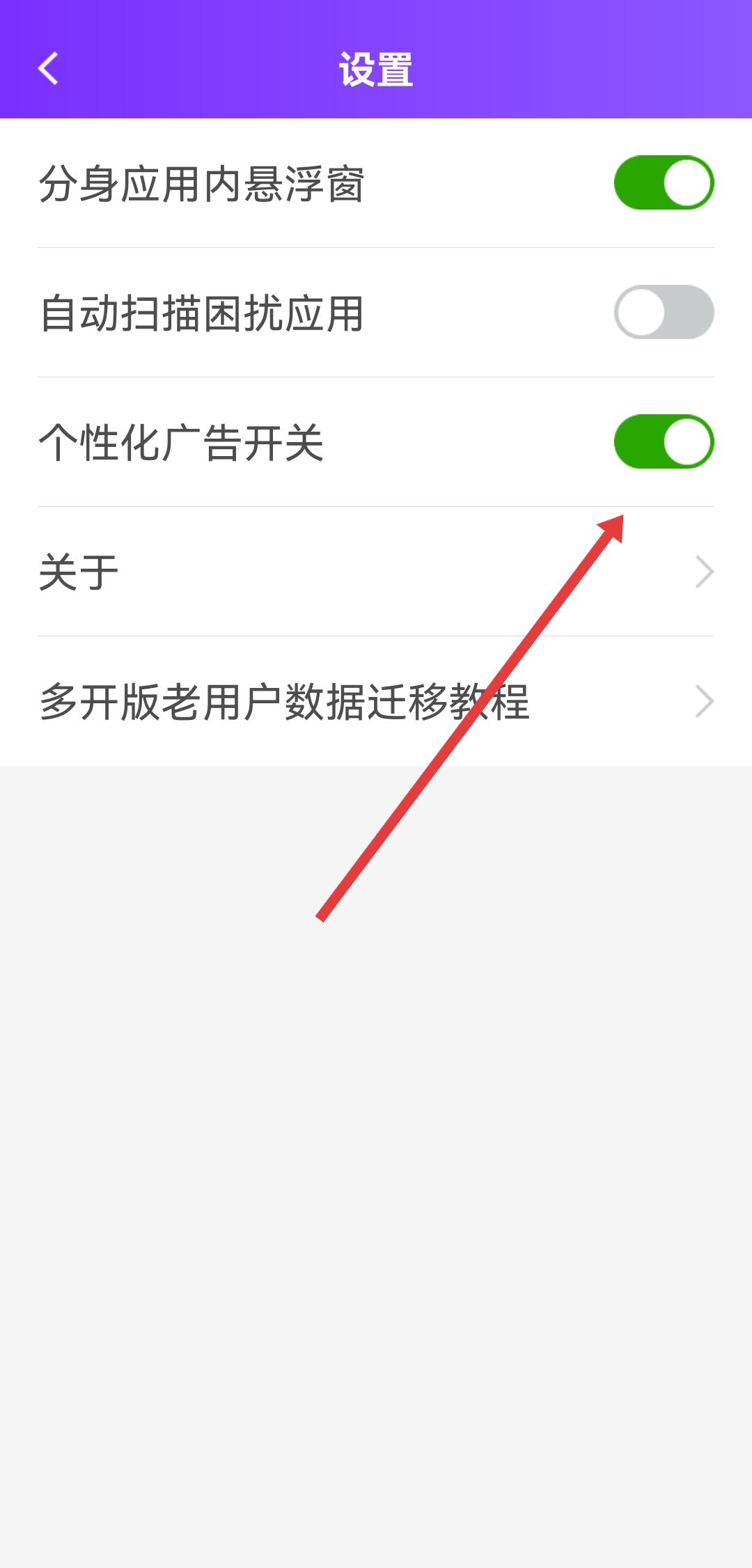3、在設(shè)置頁(yè)面,找到個(gè)性化廣告開(kāi)關(guān)選項(xiàng),此時(shí)該開(kāi)關(guān)為開(kāi)啟狀態(tài)。