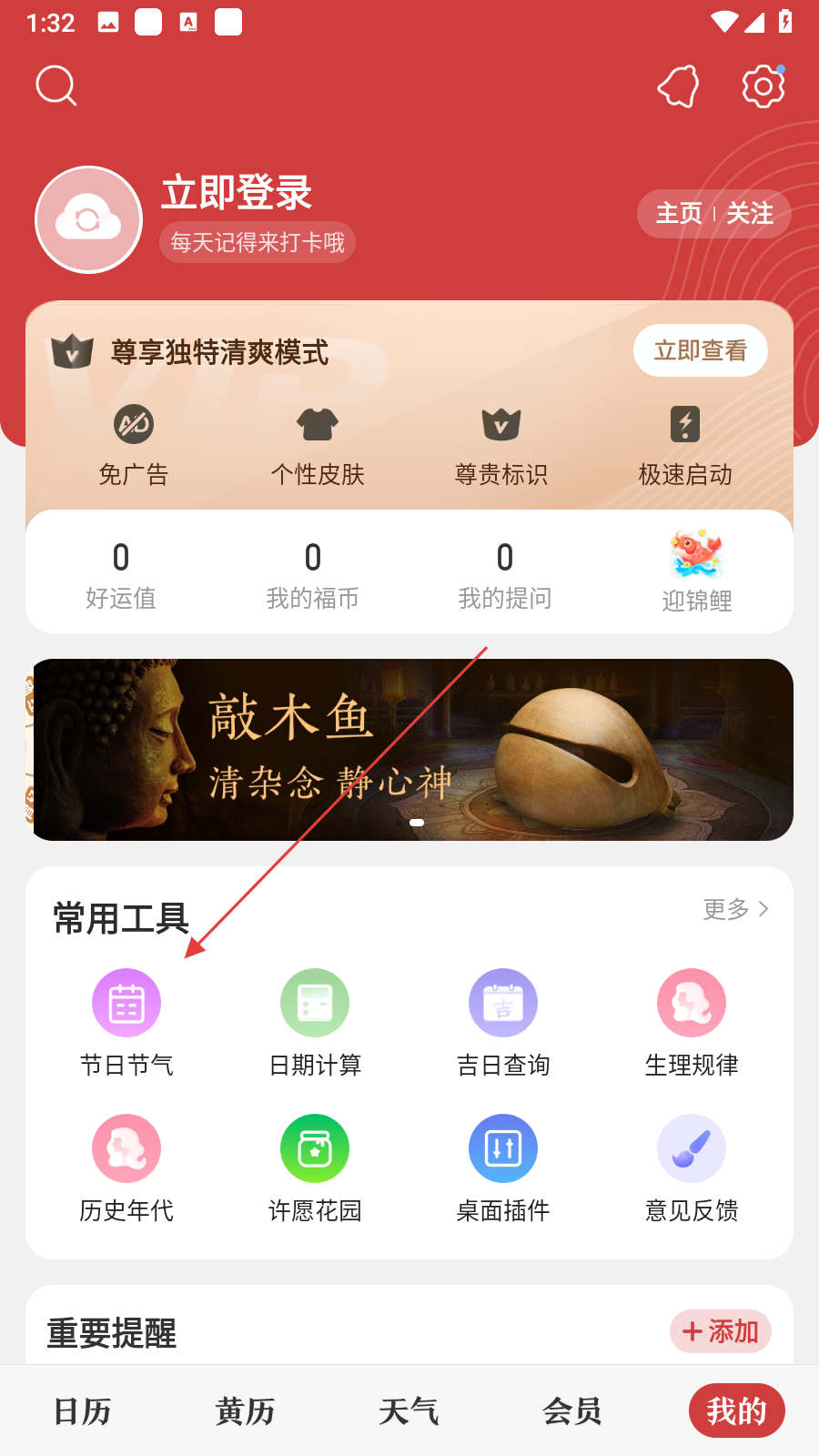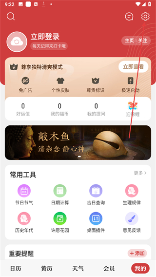 1、打開中華萬年歷應用,點擊底部導航欄中的我的選項,進入個人中心頁面,在常用工具板塊找到節(jié)日節(jié)氣選項。