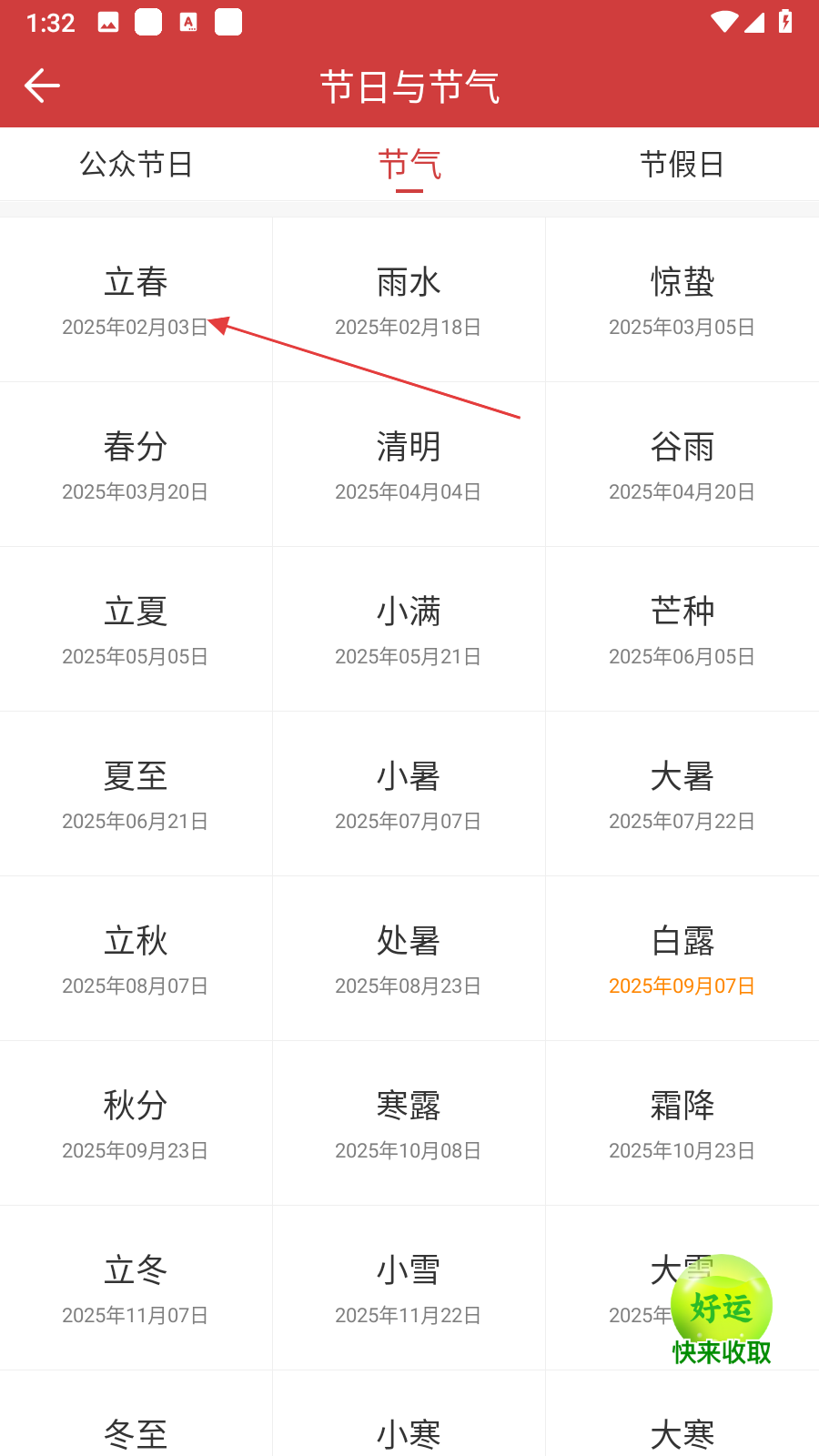 2、點擊節(jié)日節(jié)氣進入節(jié)日與節(jié)氣界面,點擊上方節(jié)氣選項卡,界面會展示全年二十四節(jié)氣以及對應的日期。