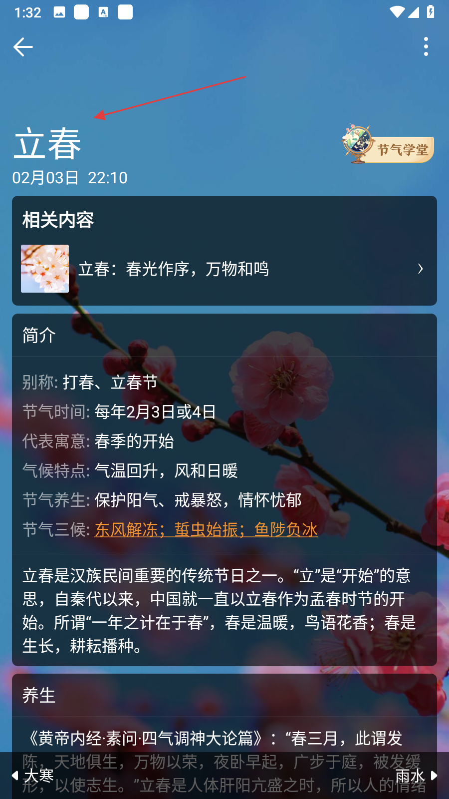 3、在節(jié)氣列表中,點擊想要查看詳細信息的節(jié)氣,比如立春,進入該節(jié)氣的詳情頁,可查看節(jié)氣具體時間,還能了解節(jié)氣的別稱、代表寓意、氣候特點、節(jié)氣養(yǎng)生等內(nèi)容。