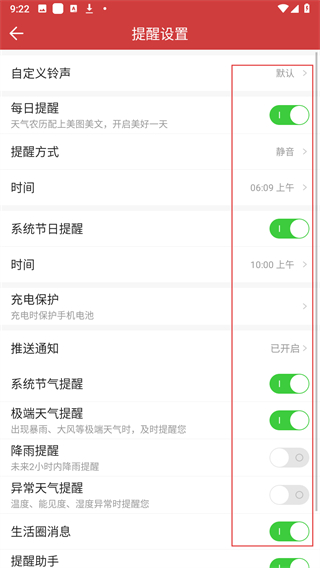 4、在提醒設置界面,可以根據(jù)自己的需求設置各類不同的提醒。