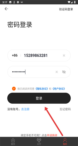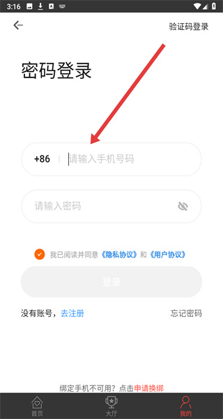 3、進(jìn)入到密碼登錄頁,點擊輸入框輸入手機(jī)號碼信息。