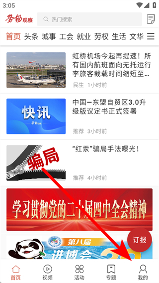 1、打開勞動觀察APP首頁,點擊底部導(dǎo)航欄的我的,進入個人界面。