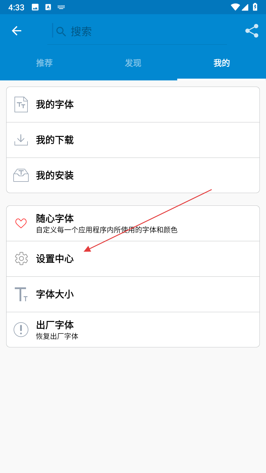 1、打開愛字體應(yīng)用,在個人中心頁面,在頁面中找到設(shè)置中心選項并點擊,進入設(shè)置中心界面。