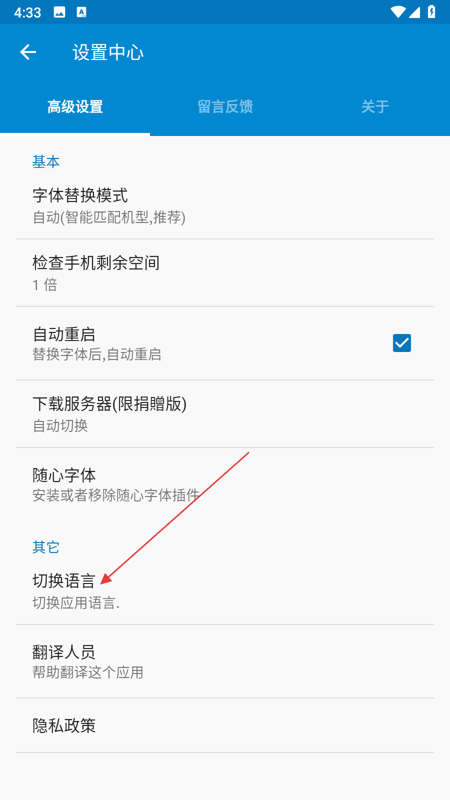 2、在設(shè)置中心界面,切換應(yīng)用語言,在其它分類下點擊切換語言選項。
