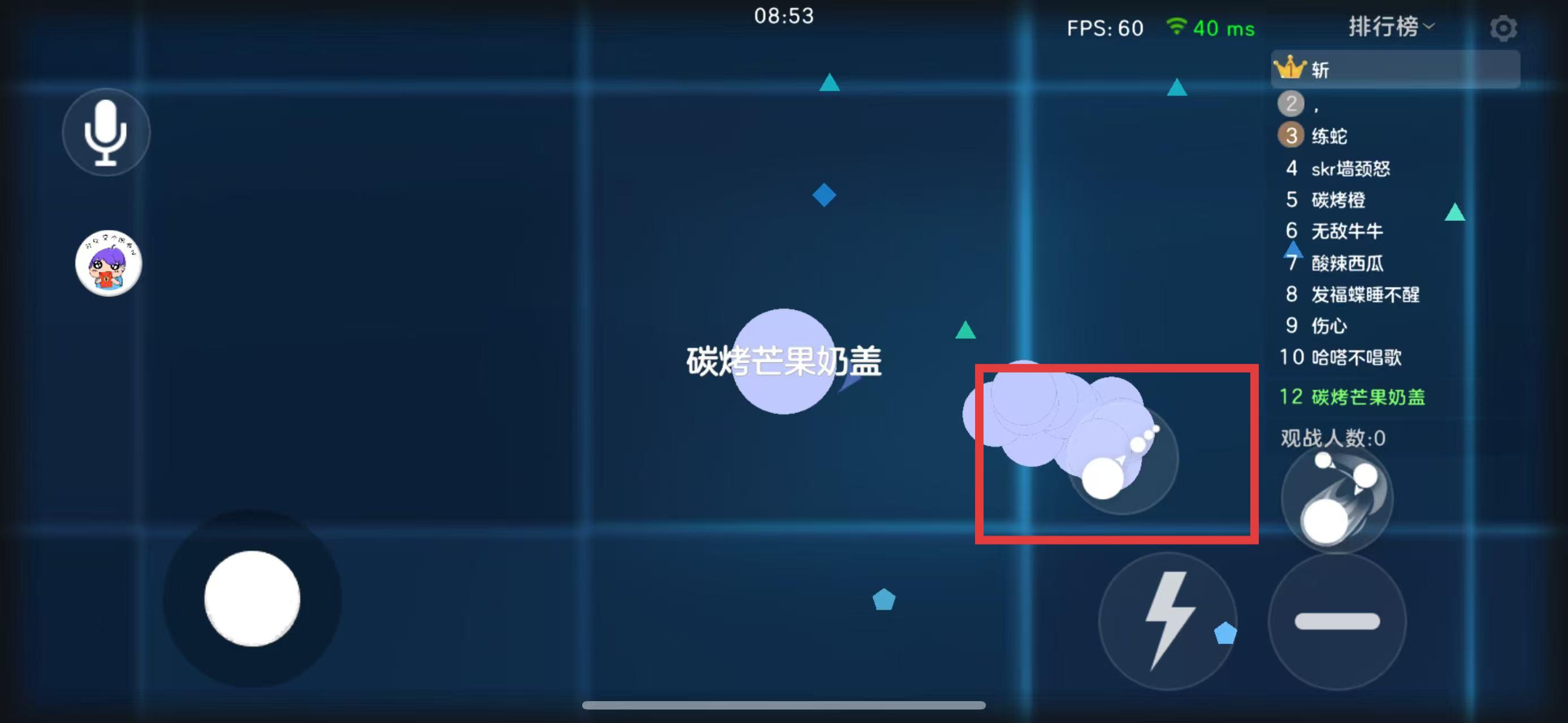 3、進入游戲后,操控球球移動,利用屏幕按鈕吐出孢子,通過吞噬他人或躲避他人吞噬,努力在規(guī)定時間內(nèi)讓自己的球球變大。