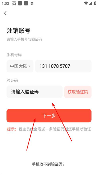 5、在注銷賬號界面輸入手機號碼,輸入收到的驗證碼后點擊下一步。