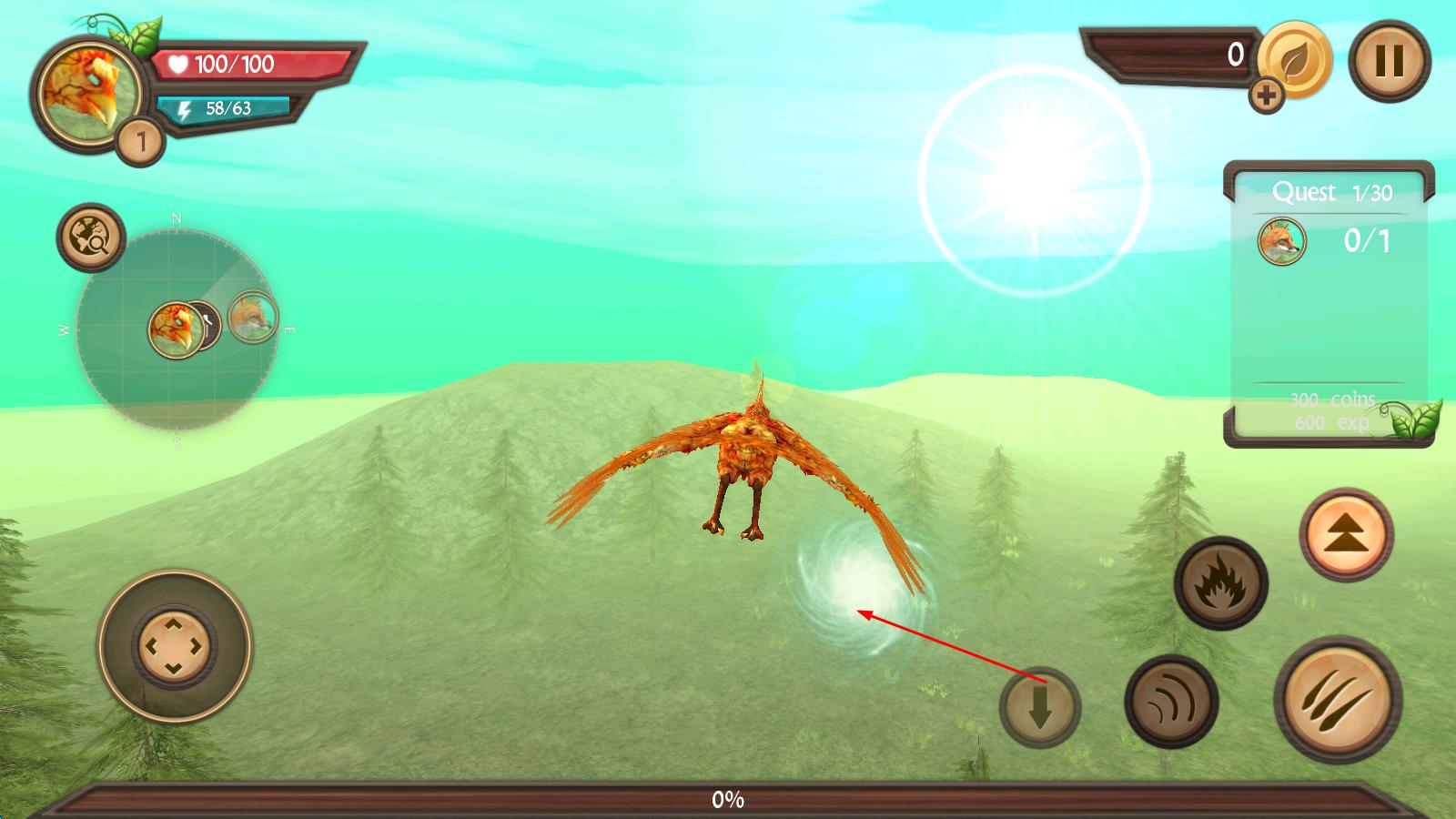 1、進(jìn)入游戲后,先熟悉虛擬按鍵操作方式,通過按鍵控制鳳凰起飛、轉(zhuǎn)向與升降,在初始場(chǎng)景中練習(xí)飛翔,初步感受鳳凰的靈動(dòng)操控手感。