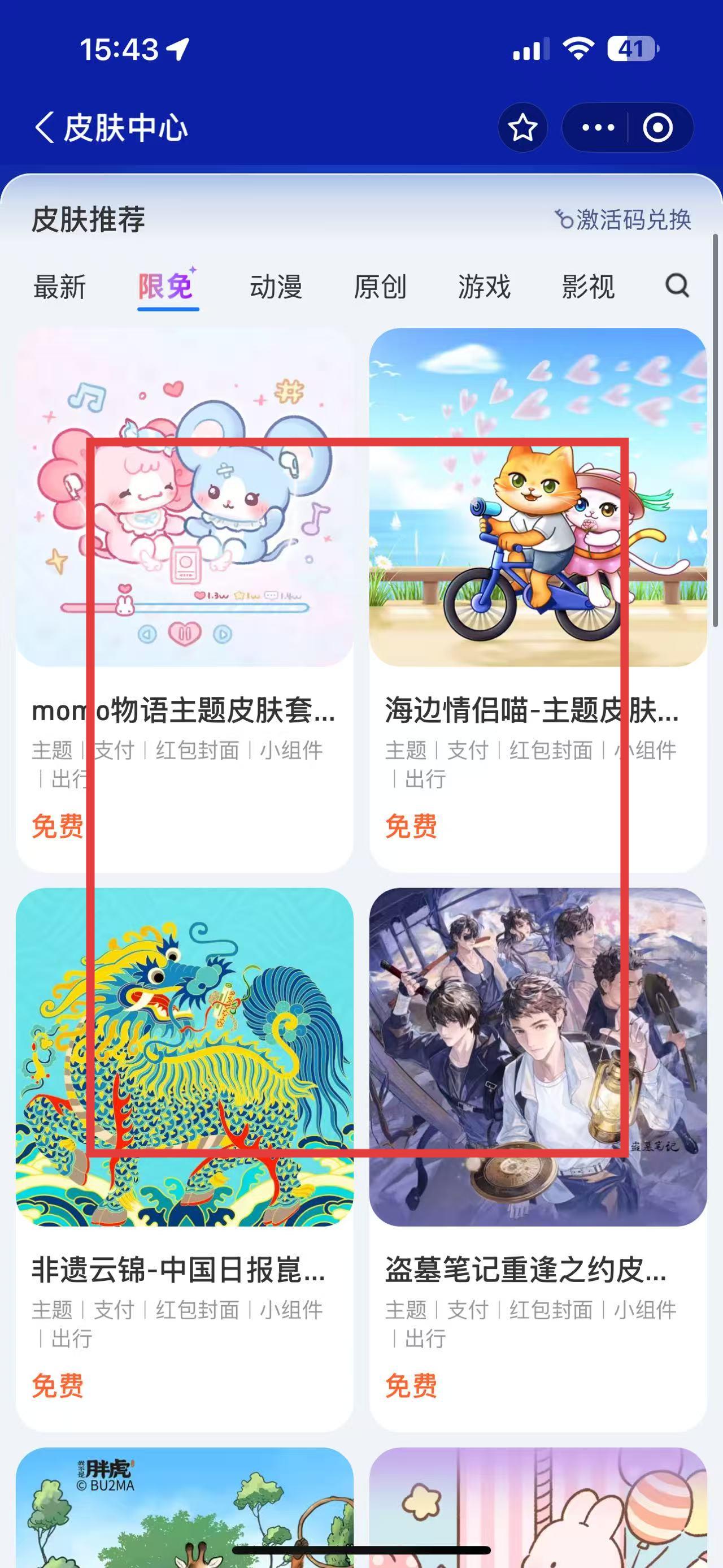 4、在皮膚中心的皮膚推薦下,選擇自己喜歡的皮膚,點(diǎn)擊對(duì)應(yīng)的皮膚圖片,按提示操作應(yīng)用該皮膚,即可更改支付寶界面顯示風(fēng)格。