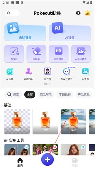 1、打開Pokecut快咔應(yīng)用,進入主界面,點擊底部中間的藍色+號按鈕,準(zhǔn)備選擇要編輯的圖片。
