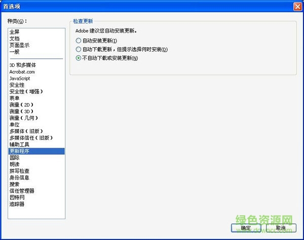 首先任意打開一個pdf文件,點擊菜單“編輯”->“首選項”,在彈出的對話框中,找到“更新程序”一項,在“檢查更新”欄目中選擇“不自動下載或安裝更新”即可。如下圖所示。