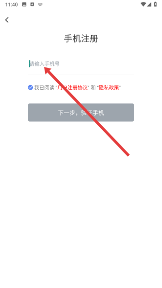 3、在跳轉(zhuǎn)到手機注冊頁面,點擊輸入框填寫手機號以便獲取驗證碼。
