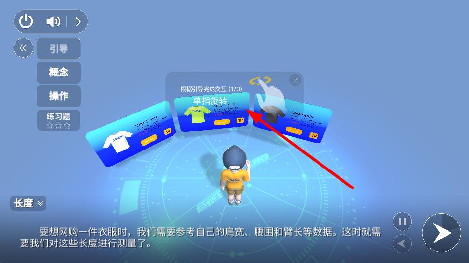 4、進入學習界面,按照引導完成交互操作,如進行單指旋轉(zhuǎn)等操作學習知識。