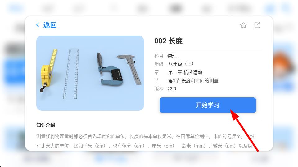 3、進入002長度詳情頁后,查看知識介紹,接著點擊開始學習按鈕。