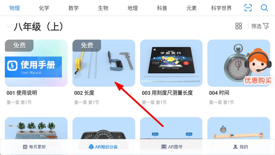 2、在AR知識分類頁面中,找到想要學習的內(nèi)容,比如點擊002長度。