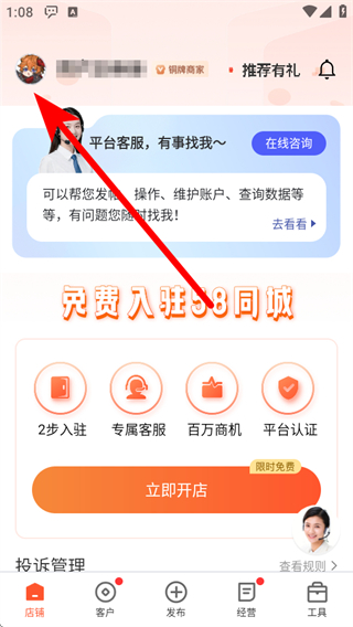 1、在58商家通個人頁面,點擊左上角頭像區(qū)域,展開功能菜單。