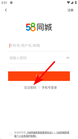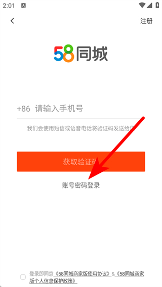 1、在58同城登錄頁面,點擊右上角注冊選項,進入注冊頁面。