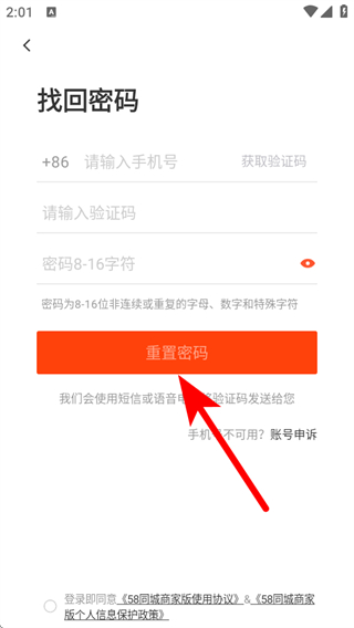 3、在頁面輸入手機號、驗證碼和新密碼,點擊重置密碼完成操作。
