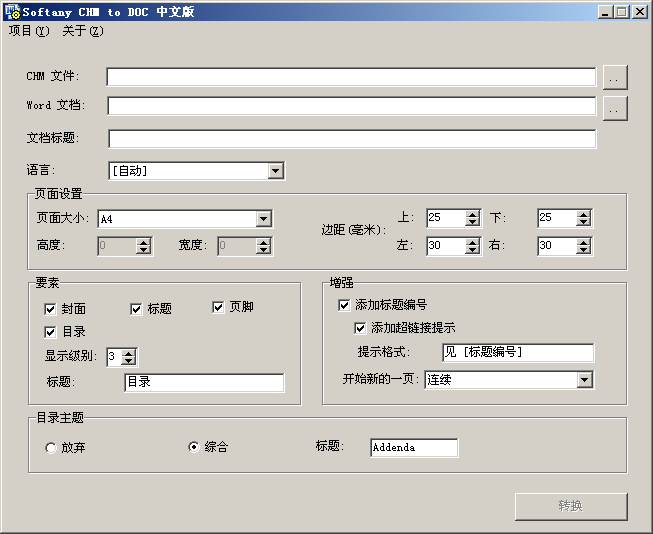 softany chm to doc是到目前為止在市場(chǎng)上最專業(yè)的chm轉(zhuǎn)doc產(chǎn)品,它可以將 Windows html 幫助 (.chm) 文件轉(zhuǎn)換成doc文件,并包含表的內(nèi)容、頁(yè)眉、頁(yè)腳、頁(yè)碼、標(biāo)題編號(hào)等!