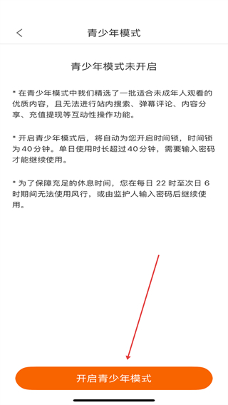 4、進(jìn)入該模式的頁面內(nèi),熟知青少年模式后再點(diǎn)擊開啟按鈕。