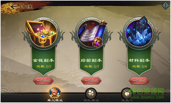 在屏幕右側(cè)還有歷練玩法,點(diǎn)擊進(jìn)入就可以看到有金幣副本、經(jīng)驗(yàn)副本、材料副本。經(jīng)驗(yàn)副本會(huì)為你提供大量的經(jīng)驗(yàn),每天都會(huì)有3次挑戰(zhàn)的機(jī)會(huì),千萬(wàn)不要錯(cuò)過哦。