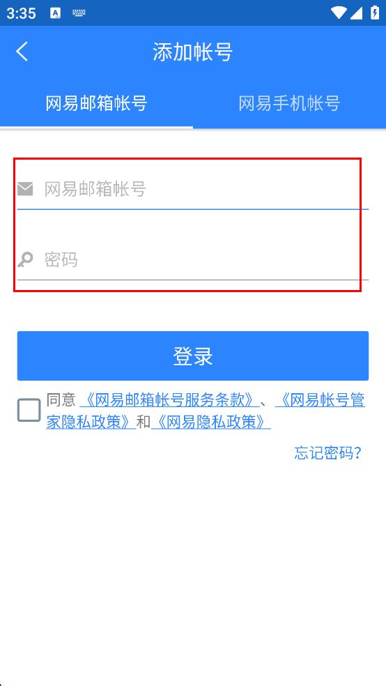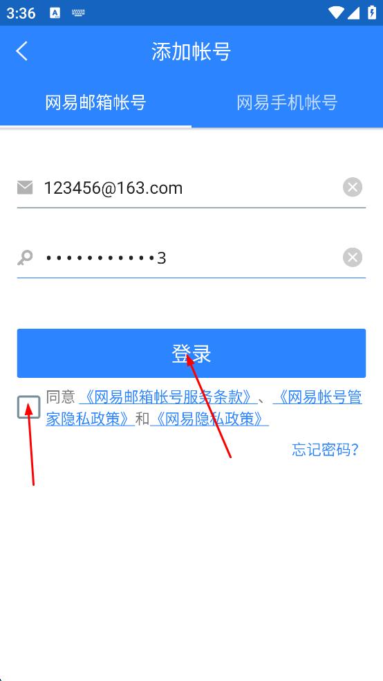 4、輸入郵箱帳號(hào)和密碼后,勾選“同意網(wǎng)易郵箱帳號(hào)服務(wù)條款、網(wǎng)易帳號(hào)管家隱私政策和網(wǎng)易隱私政策,點(diǎn)擊“登錄”按鈕,完成賬號(hào)添加操作。