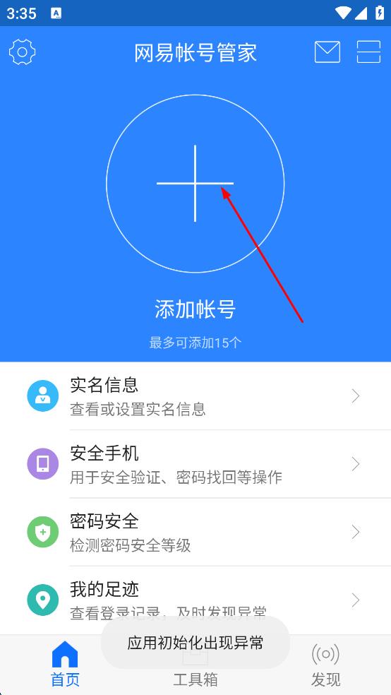 2、進(jìn)入網(wǎng)易帳號(hào)管家主界面,界面有“添加帳號(hào)”功能,還有“實(shí)名信息”“安全手機(jī)”“密碼安全”等選項(xiàng),點(diǎn)擊“添加帳號(hào)”。