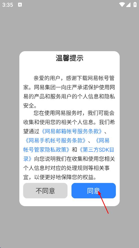 1、打開網(wǎng)易帳號(hào)管家,進(jìn)入溫馨提示界面,界面說明網(wǎng)易集團(tuán)承諾保護(hù)用戶個(gè)人信息和隱私安全,需通過相關(guān)條款和政策說明信息收集使用規(guī)則,點(diǎn)擊“同意”按鈕。